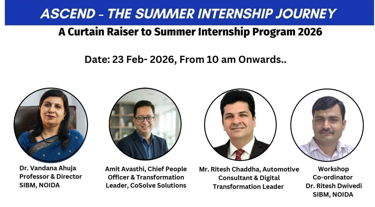 ASCEND 2026 was organised by SIBM Noida as a preparatory and experiential learning session for M.B.A. students before the commencement of their Summer Internships. The session aimed to equip students with the right mindset, professional conduct, strategic thinking ability, and AI-powered execution skills required to excel during internships and convert them into Pre-Placement Offers (PPOs). The Director, SIBM Noida delivered the inaugural address and felicitated the speakers. The sessions were delivered by esteemed industry experts, Mr. Amit Avasthi and Mr. Ritesh Chaddha, who shared practical insights drawn from their corporate experiences.